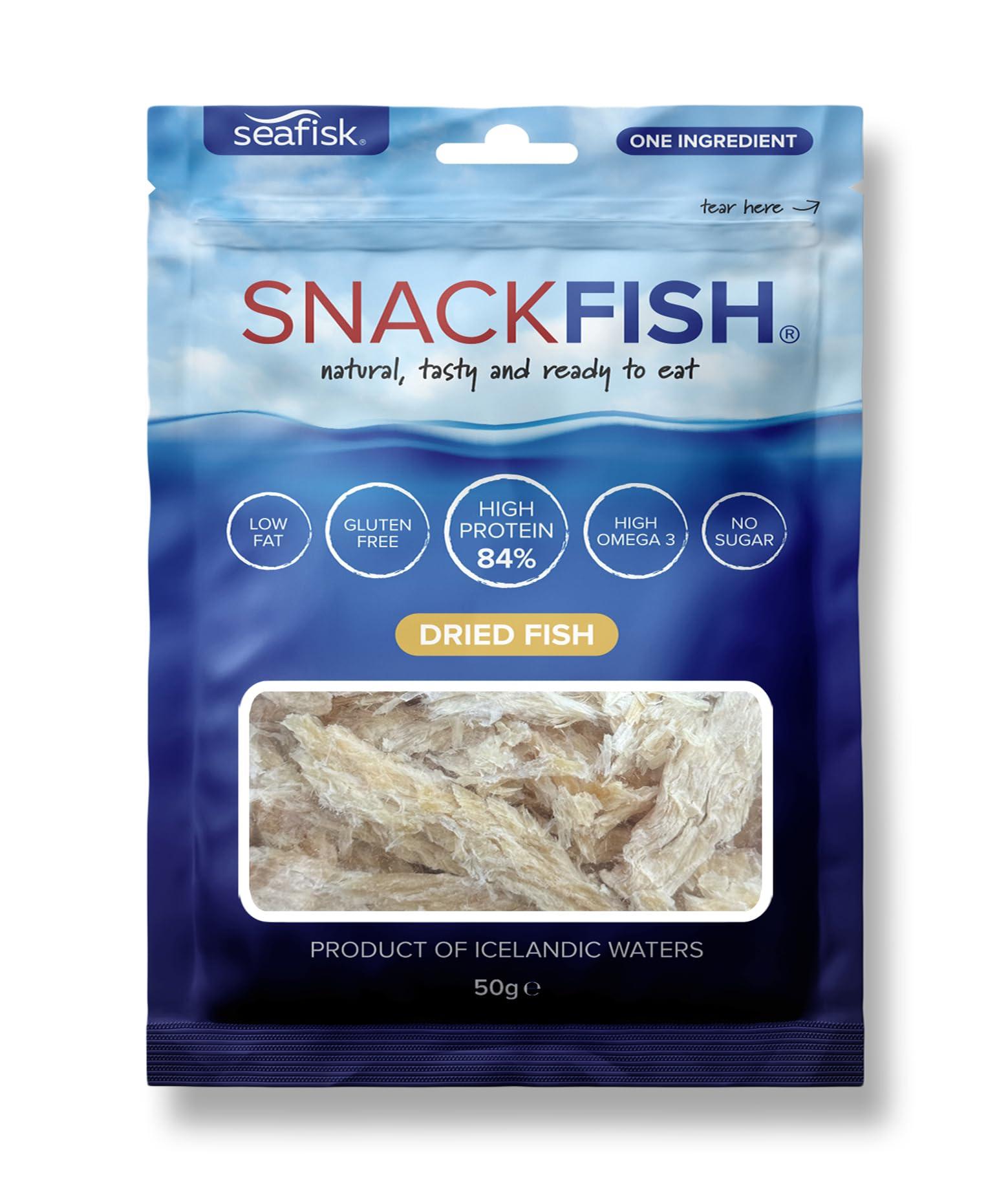 Snackfish is a 100% natural, ready-to-eat snack made with only one ingredient. Fish Jerky - Premium Icelandic Whitefish Fillet Flakes. During the drying process, only water disappears from the fresh fish and all nutrients are retained. It is high in protein (84g/100g), Vitamin B12, Folic Acid and OMEGA3. It is low in fat and contains no sugar, carbs or preservatives. Snackfish is convenient to eat on the go. It is great for exercise and an excellent source of energy to power you through the day. It can also be added to soups and stews and is great with butter. Ingredients: Wild-caught whitefish. Pack contains either Atlantic Cod (Gadus morhua) or Haddock (Melanogrammus aeglefinus). Cool dried from frozen fillets. Made with over 500g of fresh, skinless and boneless fillets per 100g of product. Gluten Free (suitable for people intolerant to gluten). Nutrition Typical Values Per 100g: Energy 1465 kJ/345kcal, Fat 1g, of which saturates 0.2g, -Monounsaturates 0.2g, -Polyunsaturates 0.4g, of which OMEGA 3 300mg, of which sum EPA & DHA 300mg, Carbohydrate Nil, of which sugars Nil, Protein 84g, Salt 2g. Vitamins Per 100g: Vitamin B12 6.1 g, Folic Acid. 75 g. Sustainably sourced. Produced in Iceland using green renewable energy.