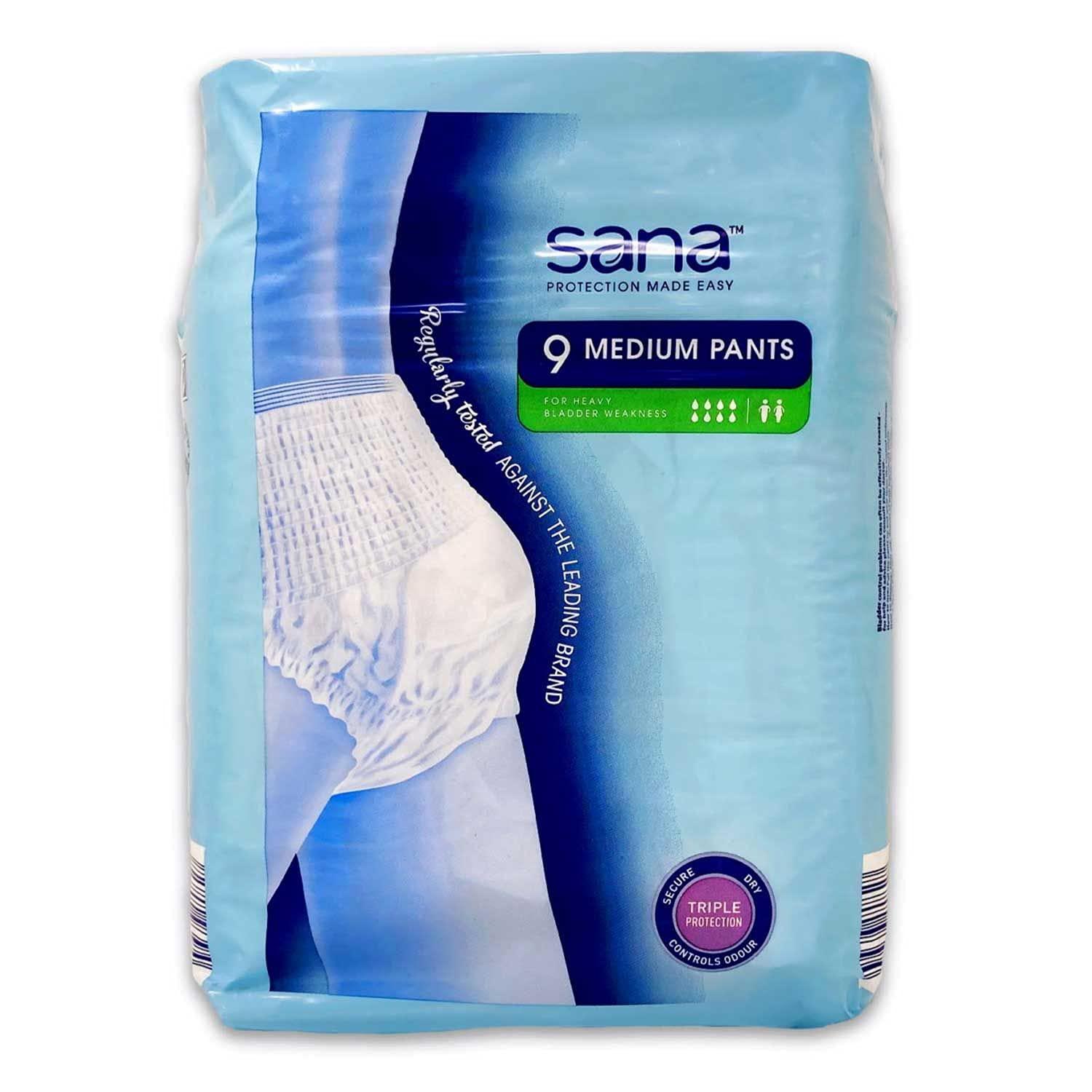 Sana Incontinence Medium Pants, your reliable companion for discreet and comfortable protection against moderate to heavy urinary or bowel incontinence Our convenient pack of 9 medium-sized pants is thoughtfully designed to offer superior absorbency and leakage prevention while ensuring you stay dry and comfortable throughout the day Crafted with precision and care, these pants feature advanced technology to provide maximum absorbency without sacrificing breathability or comfort The soft, flexible material conforms to your body for a secure fit, allowing you to move with confidence and freedom Sana Incontinence Pants are the perfect solution for active individuals who refuse to let incontinence hold them back Whether you're at work, running errands, or enjoying time with loved ones, you can trust Sana to keep you protected and confident Each pack contains 9 individually wrapped pants, making them ideal for travel or on-the-go convenience Say goodbye to the worry and embarrassment of leaks and accidents with Sana Incontinence Medium Pants the discreet, reliable, and comfortable choice for managing incontinence
