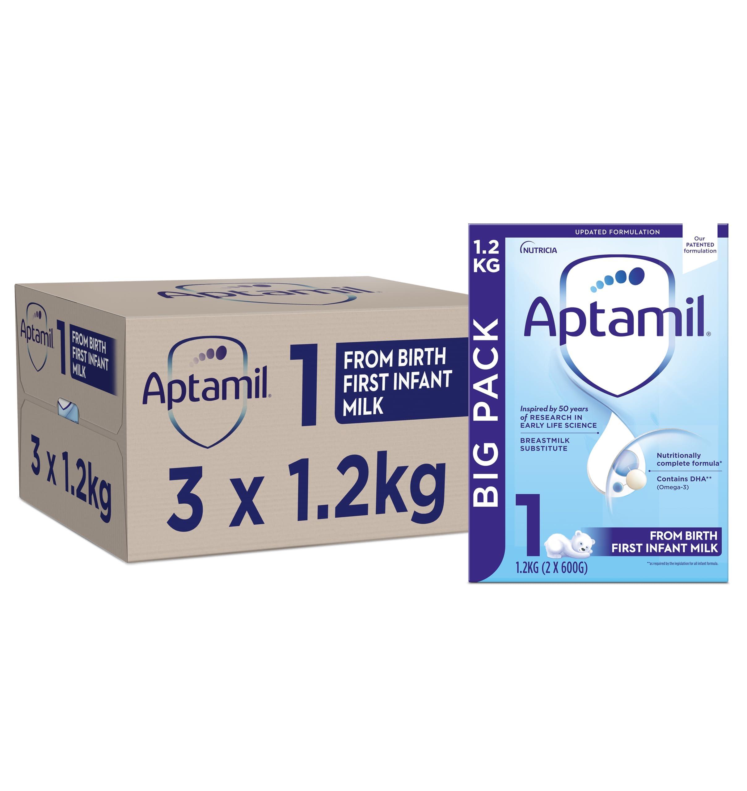 Our nutritionally complete formula is suitable as a sole source of nutrition from birth and as part of a weaning diet from 6 months. Contains DHA(Omega-3) as required by the legislation for all infant formula. Aptamil First Infant Milk is a breastmilk substitute and is suitable for babies from birth. The beginning of your baby's life is a special and beautiful time. Our passionate team of more than 500 scientists and experts have developed our Aptamil First Infant Milk, inspired by 50 years of research in early life science. Our formulation is nutritionally complete and suitable from birth as a breastmilk substitute. Breastfeeding is best. Infant milk is suitable from birth, when babies are not breastfed and should only be used on the advice of a doctor, dietitian, pharmacist, or other professional responsible for maternal and child care. When bottle feeding do not allow prolonged or frequent contact of milk feeds with your baby's teeth as this increases the risk of tooth decay. Ask your healthcare professional or dentist for advice. Make sure your baby's teeth are cleaned after the last feed at night. Contents may settle in transit. The scoop may become submerged in the powder, please use a clean, dry knife to find it.