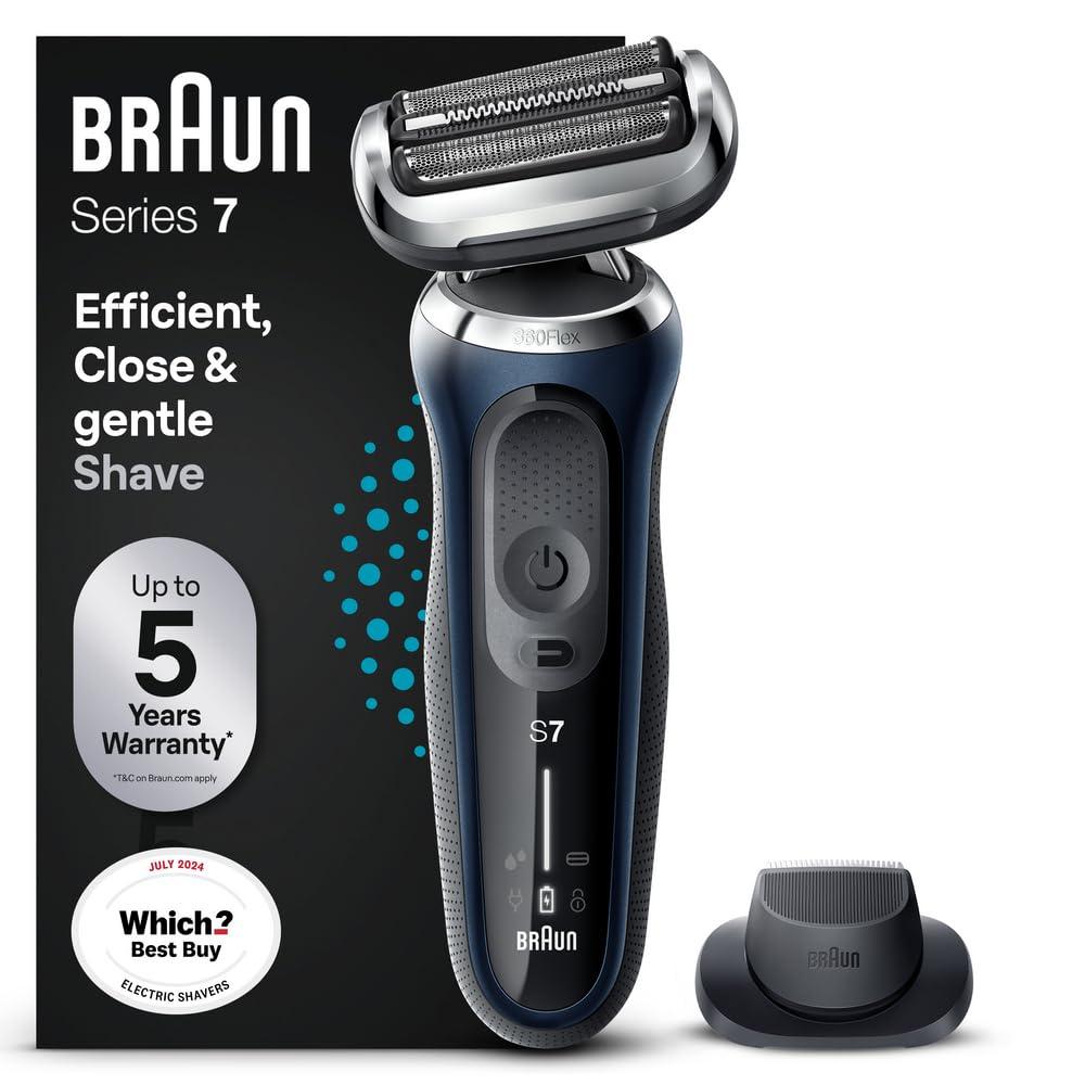 Braun Series 7 electric shaver for men with 360 adaptation for a smooth shave. Features Autosense technology that reads and adapts to your beard density, removing more hairs in every shave.The Li-Ion Battery provides up to 3 weeks of shaving and a 5 min quick charge. This men's electric razor is 100% waterproof for Wet & Dry use.Compatible with EasyClick system.Box includes:1x Series 7 Electric razor for men1x Precision trimmer attachment1x Travel case1x Smart plug for automatic 100-240 voltage adjustment1x Cleaning brush