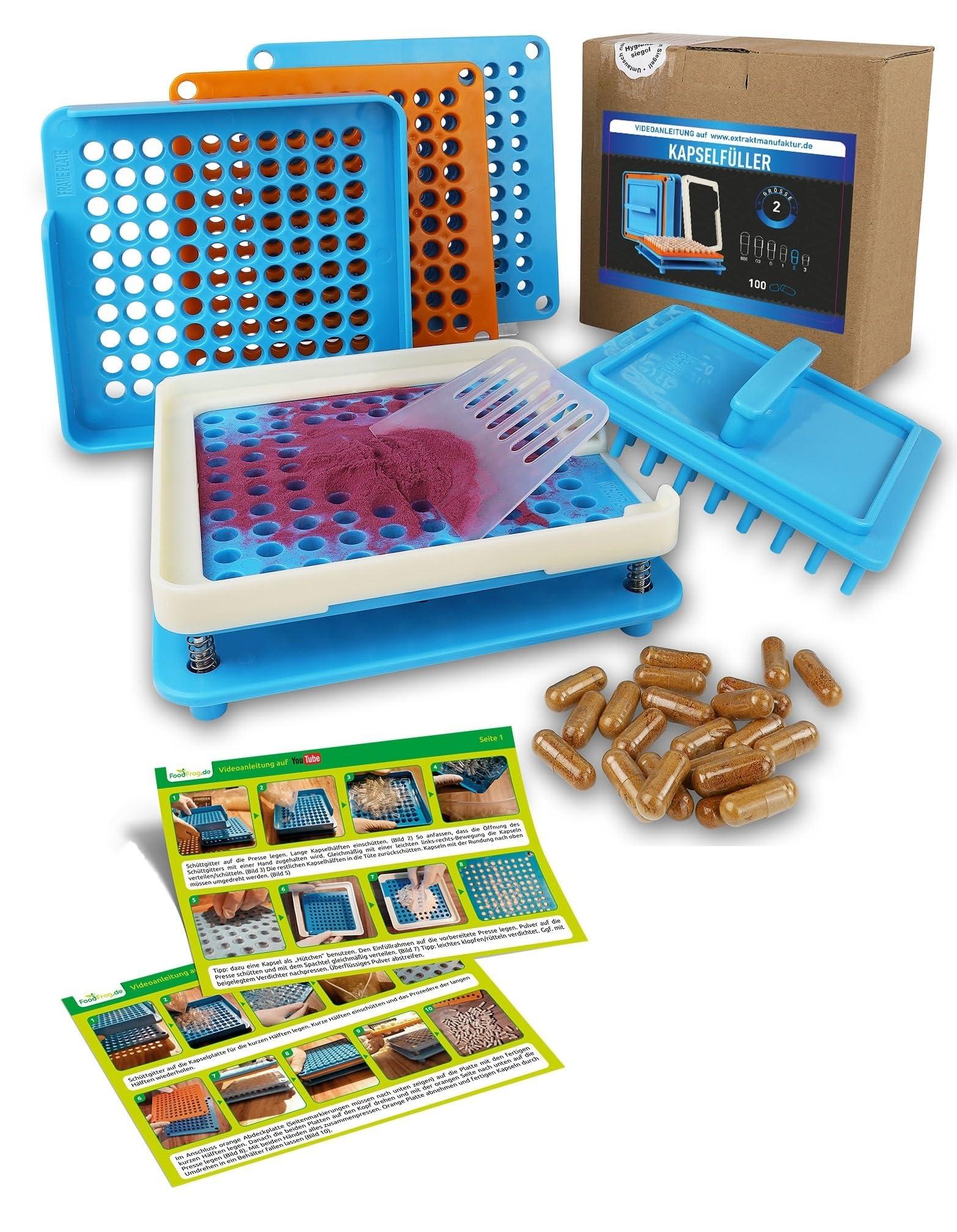 - Capsule filler: the capsule press (also called capsule filler capsule filler) with the 100 holes plate allows you to fill 100 empty capsules of size 2 (17 mm) with one pressing process at the same time. You can only use size 2 capsules with this filler.