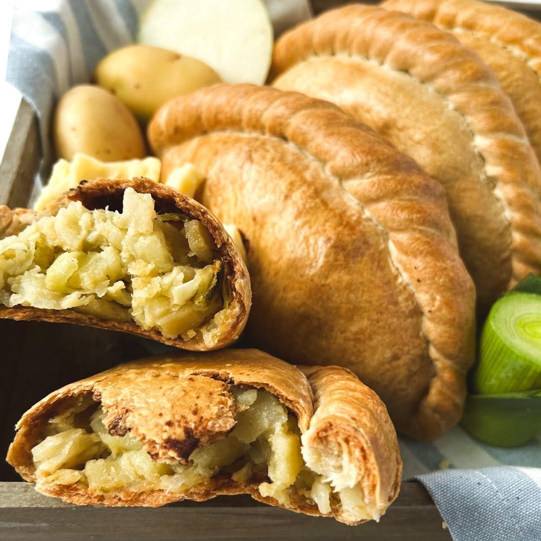 - 8 x Cornish Pasties Freshly baked to perfection, these pasties have a golden, flaky pastry shell and are filled with delicious Cornish Ceddar Cheese, tender potatoes, sweet-earthy onions, and seasoned to perfection. Your first bite will instantly transport you back to a Cornish harbour.