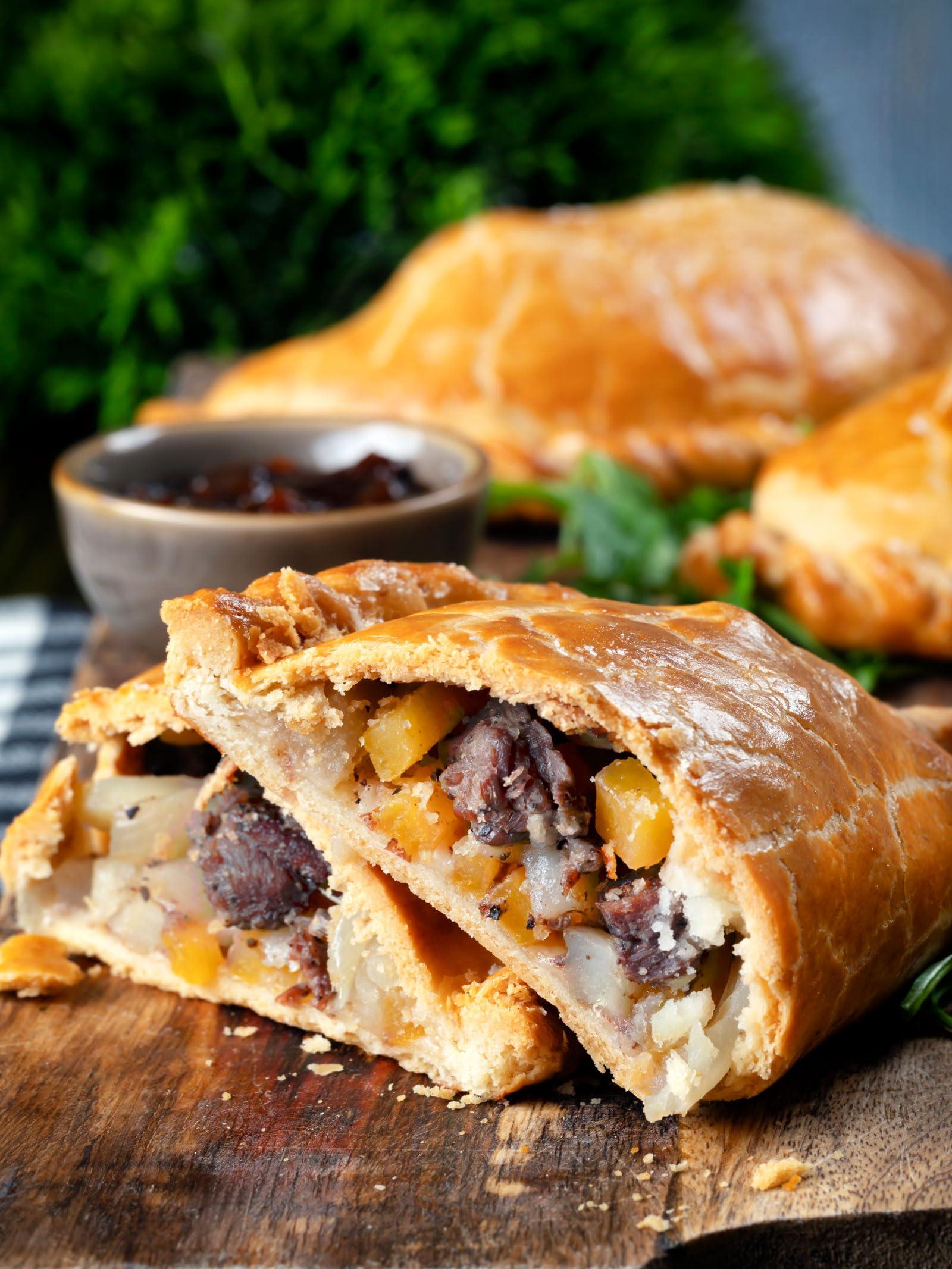 - 8 x Cornish Pasties Freshly baked to perfection, these pasties have a golden, flaky pastry shell and are filled with delicious skirt beef, tender potatoes, sweet-earthy onions, and seasoned to perfection. Your first bite will instantly transport you back to a Cornish harbour.