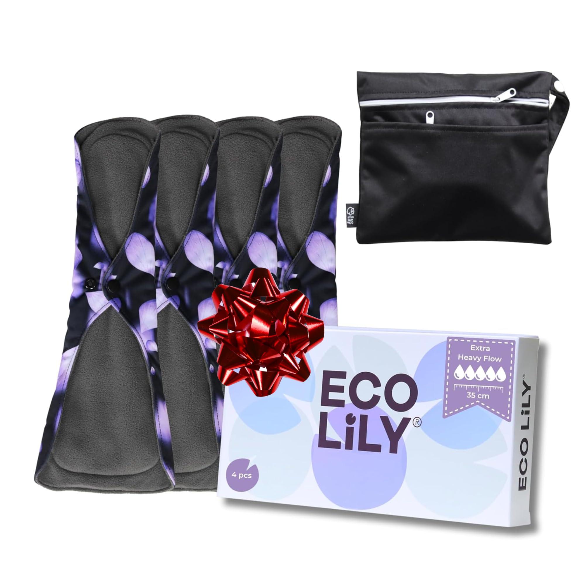 - SUPER ABSORBENT - Eco Lily Reusable Sanitary Pads for Extra Heavy Flow (30cm) offer maximum protection: three layers of ultra-absorbent microfiber, an odour-absorbing bamboo charcoal fleece layer, and an outer layer of waterproof PUL fabric to prevent any leaks from happening. Perfect for very Heavy Flow Periods - Night Time & Maternity. Each set contains 4 reusable pads and a waterproof, zippered pouch with 2 compartments.