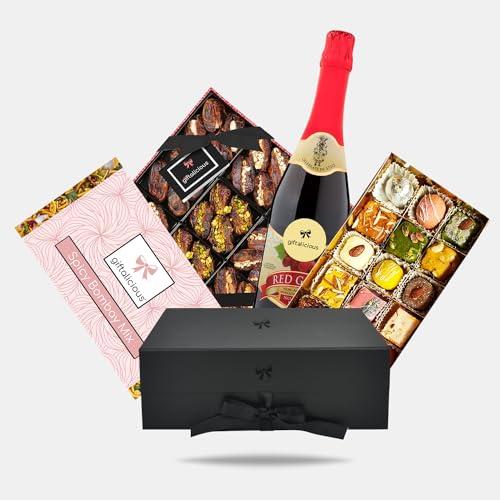 A beautifully presented halal hamper containing a collection of halal treats to impress your recipient. Freshly made Artisan Barfi in an array of exotic flavours, spicy Bombay Mix, a non-alcoholic sparkling Juice with cork, wrapped inside a luxury magnetic hamper box, packed with hay and personalised with your special gift message. Made exclusively by Giftalicious.