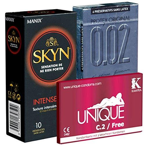 Try and enjoy - which latex free condom is your favourite? This mix pack contains: 1 x Manix SKYN Intense 10 latex free condoms from France, dotted and made of polyisoprene. 1 x Kamyra Unique C.2 Free 3 latex free condoms with flat base (without ring), ultrathin (0.02mm) and made of AT-10. 1 x Protex Original 0.02 6 latex free condoms from France, made of polyisoprene. In total 19 lubricated condoms without latex. Latex free condoms are hypoallergenic and suitable for people with latex allergy. Furthermore, they are absolutely odourless and therefore also recommended for those who don't like the feeling, taste or smell of latex!