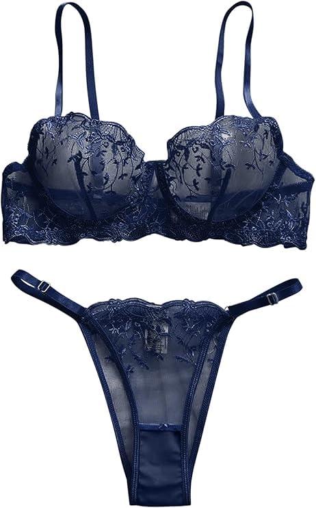 Lilosy Sexy Floral Embroidered Mesh Women Underwire Push Up Lingerie Set, Leaf Navy Blue, XS