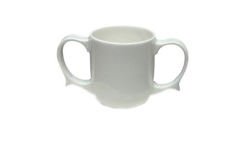 The mug is ceramic, made from vitrified earthenware with added alumina for extra strength and supplied in white. It is discreetly designed to blend in to the look of standard ceramic tableware and is much more attractive and dignifying to use than alternative plastic beakers. The mug has a large handle on either side, both of which are big enough to slip several fingers through which makes the mug easy to hold. You are less likely to spill liquid because you can hold the mug securely using both hands rather than just one. The mug has a capacity of up to 250 ml and weighs 320 g. It can be used for hot or cold drinks and is suitable for use in dishwashers, microwaves and freezers. It is completely lead free.