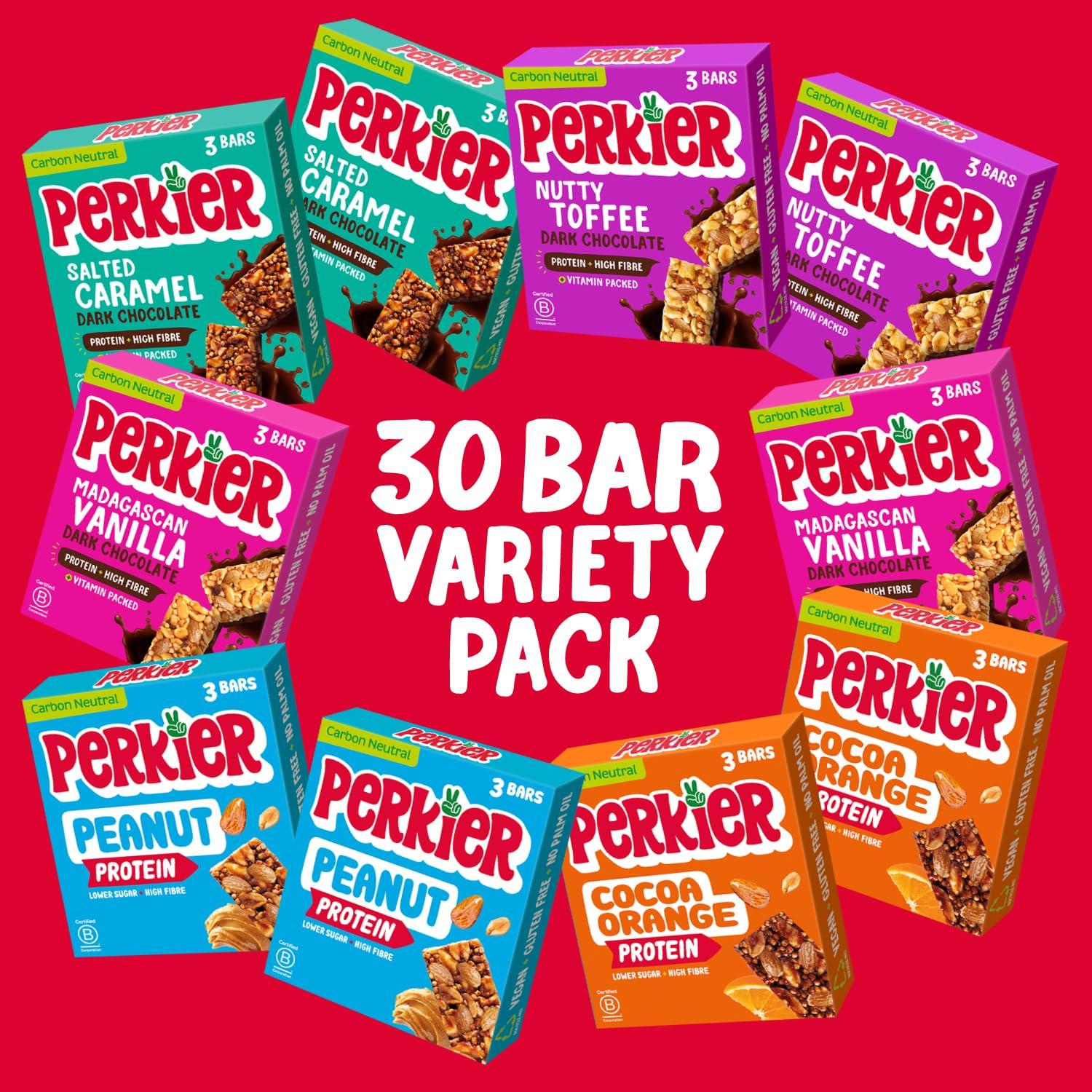 - Perkier 30 Bar Variety Box 5 different flavours including Salted Caramel & Dark Chocolate, Nutty Toffee & Dark Chocolate and Peanut