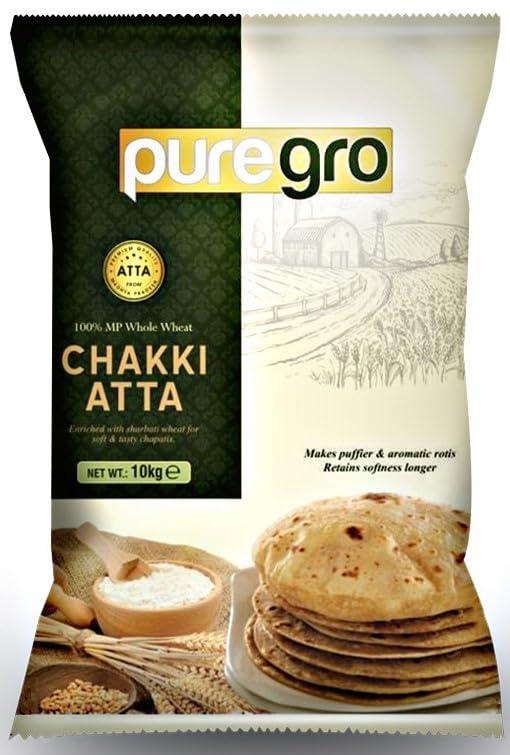 Puregro CHAKKI ATTA 10kg 100% Whole Wheat Atta. NET WT : 10kg e Product of INDIA. Puregro Chakki Atta is Ideal For Traditional Chapatti's. Puregro Chakki Atta Premium Quality Chakki Atta. Puregro Chakki Atta Enriched with SHARBATI WHEAT for SOFT & TASTY Chapatis. Makes Puffier & Aromatic Rotis with Puregro CHAKKI ATTA. Puregro Chakki Atta is made with 100% Whole Wheat which makes it extremely nutritious since its packed with health benefits.