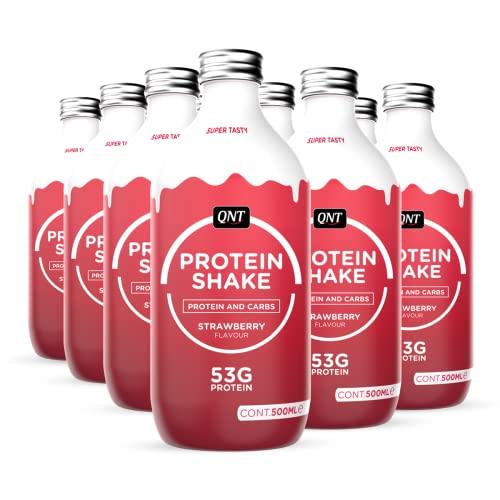 QNT - protein shake RTD, package with 12 bottles of 500 ml each. One bottle (500 ml) provides 53 g Protein and 55 g carbohydrates. Made from protein-enriched skimmed milk. One bottle has 449 calories. Available in 5 delicious flavours.