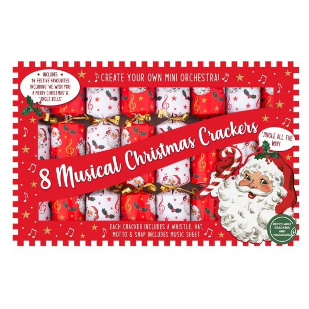 - This box of eight musical crackers features a musical script, holly and Santa design printed on a white or red base and finished with gold curling ribbon.