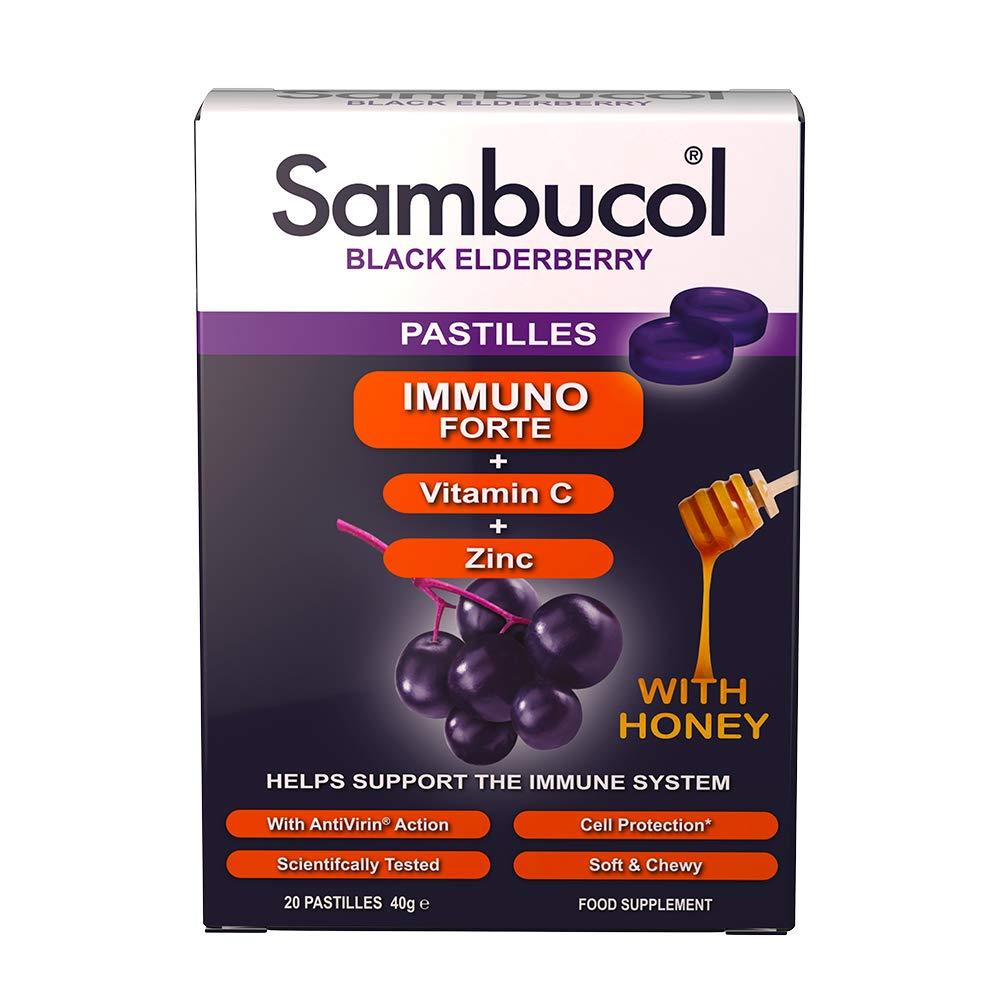 - FAMILY IMMUNE SUPPORT - Sambucol Immune Forte Chewable Pastilles contains Black Elderberries as well as Vitamin C, Zinc and Honey to help support the immune system. Suitable for adults and children aged 6+