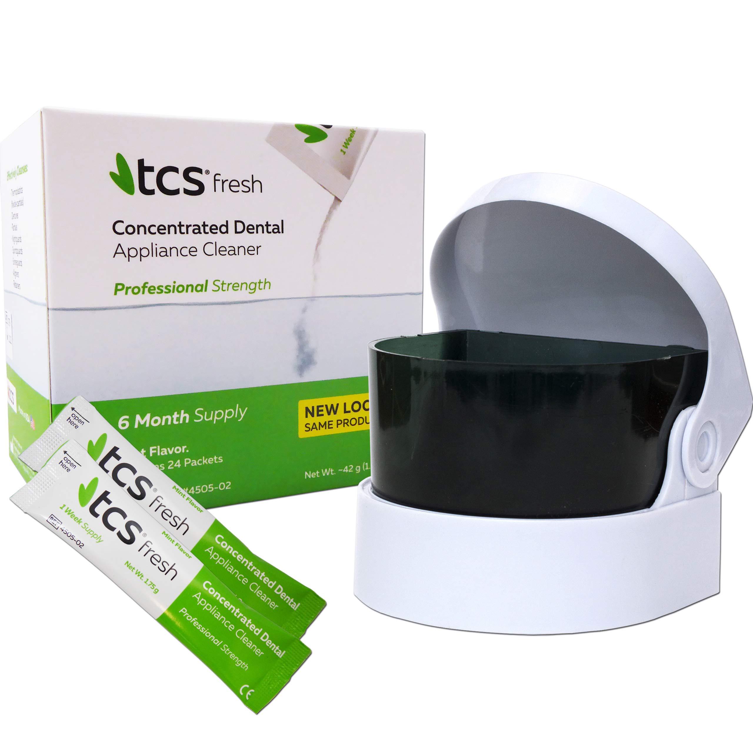 TCS Concentrated Denture Cleaner safely, quickly and effectively maintains the cleanliness of all dentures and dental appliances. One box of TCS Cleaner is designed to last up to six months making it an economical solution to conventional denture cleaners. It is a non-abrasive cleaner specifically designed for the hygienic cleaning and maintenance of TCS appliances and all others. TCS Cleaner is supplied in boxes of 24 sachets, each sachet will make one week's supply of solution. One sachet is mixed with a cup of warm water - this solution will last for 7 days before needing to be replaced. A daily 15 minute soaking has proven to be effective in maintaining the appearance and cleanliness of dental appliances. Overnight soaking in TCS Cleaner solution will not harm your appliance. Sonic Denture Cleaner Its simple to use; place your appliance inside, add your chosen cleaning agent, close the lid and press the on/off button. The perfect solution for low maintenance denture care; you can drop your denture in the sonic cleaner while you take a shower, cleaned and ready to pop back in for when you're finished. Requires 2 AA batteries. Maximum external dimensions : Height 7.5 cm x Width 9.1 cm x Length 8 cm. Why use a Sonic Cleaner? A sonic cleaner uses vibrations to create tiny bubbles in liquid. This is used to thoroughly clean dentures as the bubbles dislodge and remove contaminants and food particles from areas of dentures that are otherwise difficult to clean. Combining this action with a suitable denture cleaner will greatly enhance the effectiveness of this process.