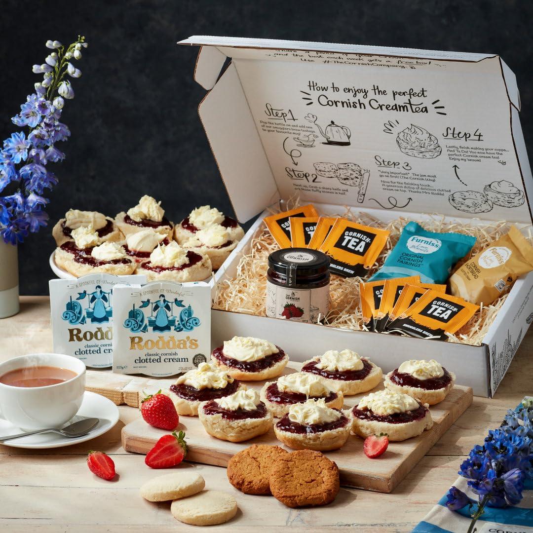 The Cream Tea Hamper Extra Scones, Jam & Cream by The Cornish Company is a delightful assortment of freshly baked plain scones, Roddas Cornish Clotted Cream, Cornish Company Strawberry Conserve, and Smugglers Brew Black Tea Bags. This hamper also includes Original Cornish Fairings Biscuits and Clotted Cream Shortbread Biscuits, perfect for up to 8 people. The scones come in a cornish themed box