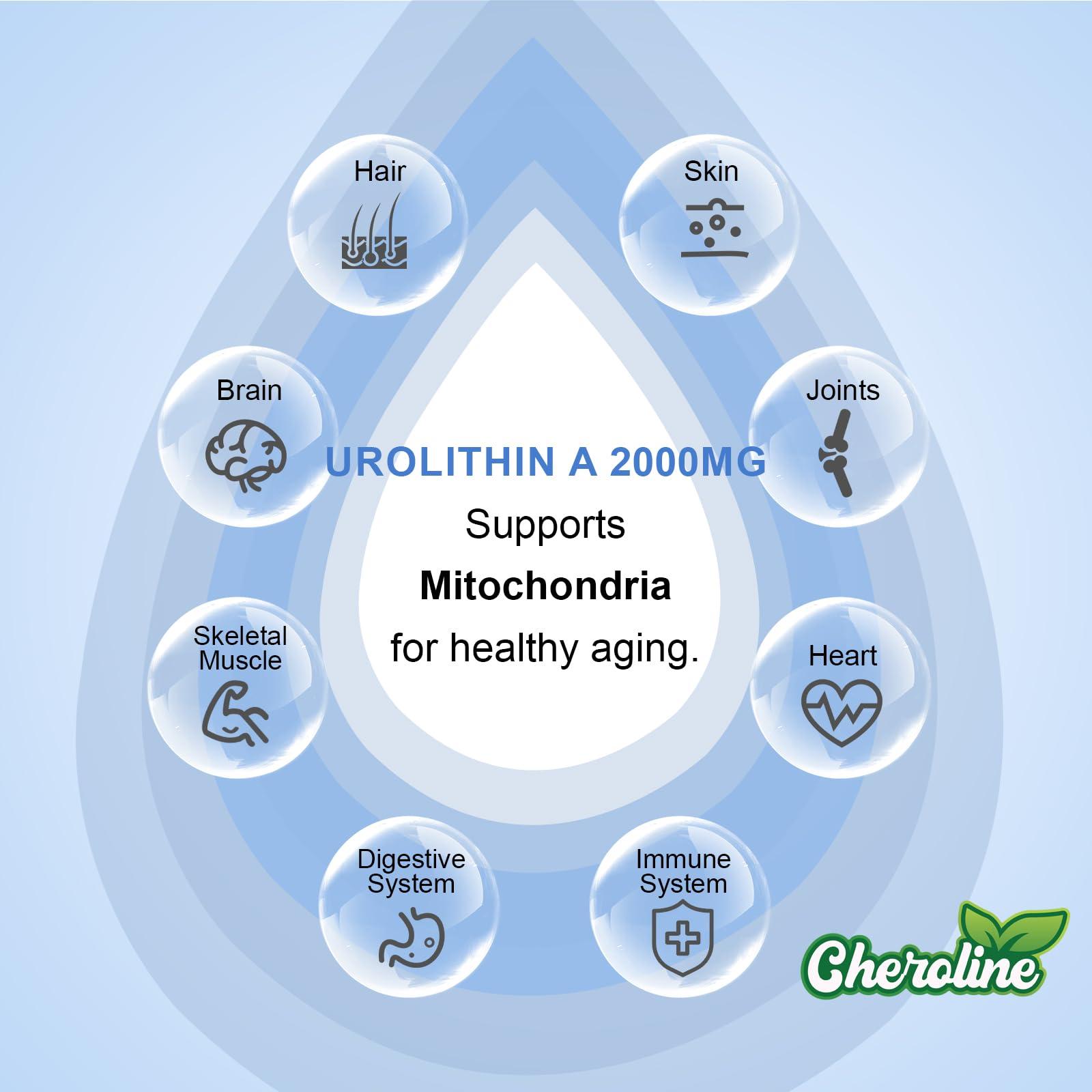 - Quality Assurance: Cheroline urolithin A supplement features meticulously sourced organic ingredients, rigorously tested to be free from synthetic pesticides and fertilizers, ensuring peace of mind for health-conscious consumers. With each bottle providing a 60-day supply, certified Non-GMO, and free from gluten, soy, and dairy, our product caters to diverse dietary needs and preferences, prioritizing both health and satisfaction.