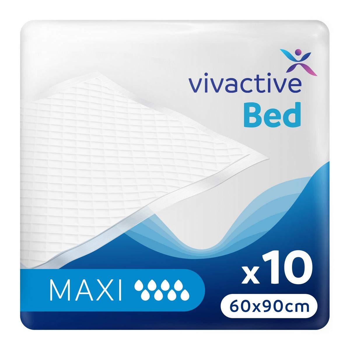 Vivactive Maxi bed pads absorb twice the amount of liquid than some other bed pads of the same size. This is because the length of the fibres in the "fluffy" part of the pad are three times longer than in some other bed pads, allowing the pad to absorb more liquid. Fast Absorption Vivactive Bed Pads feature channels that aid the distribution of liquid allowing for faster absorption. Superior Protection Against Leaks Once liquid has been absorbed, hydrophobic barriers along the edges of the pad help to prevent liquid reaching your bedding, whilst a waterproof backing prevents leakage from the bottom - even under pressure. This makes Vivactive Bed Pads an ideal solution for beds, chairs and wheelchairs, as well as other soft furnishings. 2600ml Absorbency Vivactive Bed Pads Maxi have an absorbency of up to 2600ml, twice the amount of some other bed pads. This is because the length of the fibres in the "fluffy" part of the pad are three times longer than in some other bed pads, allowing the pad to hold more liquid. Soft and Comfortable As well as providing fast-acting absorption and excellent security against leaks, Vivactive Bed Pads feature a super soft top layer, so youll be completely comfortable, whatever the situation.